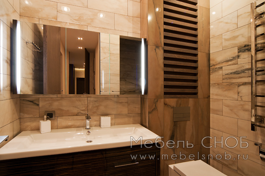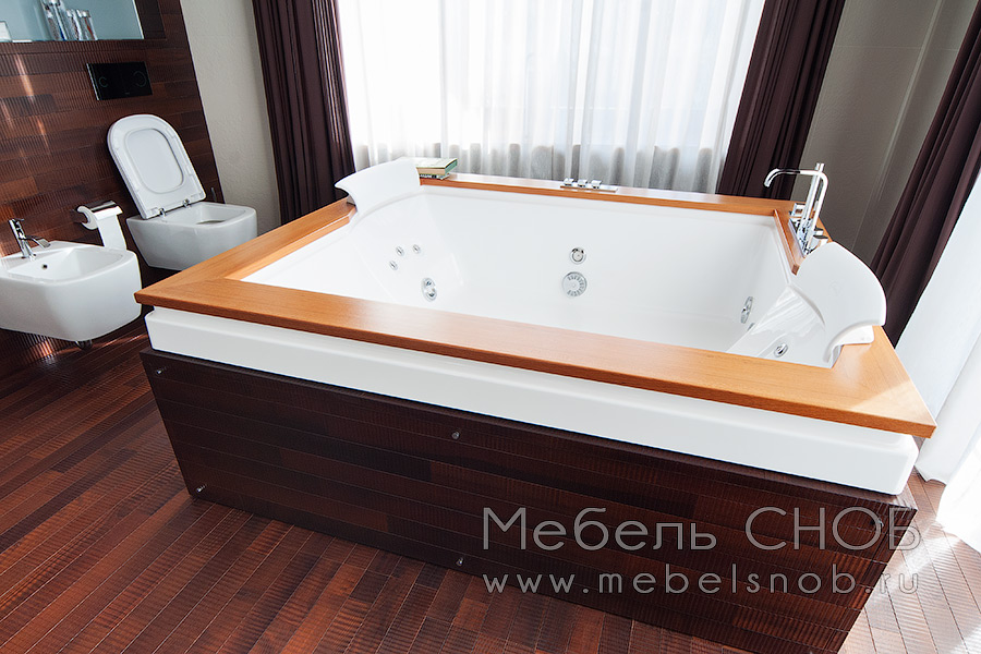 Для декорирования ванной комнаты с джакузи использовалась термодревесина - натуральное дерево, полученное с использованием современных процессов термообработки. Основное преимущество термодоски - геометрическая стабильность, вне зависимости от перепадов влажности и температуры. Также основным достоинством термодревесины в интерьере с джакузи является водоотталкивание - способность впитывать влагу у данного материала значительно снижено. Термообработанная древесина является наиболее долговечным материалом при декорировании ванных и душевых комнат с джакузи.