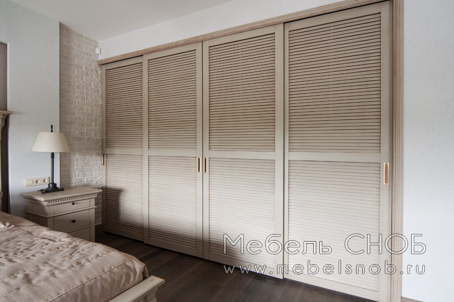 Встроенный шкаф-купе с жалюзи (ламелями) на дверях. Изготавливается по размерам помещения заказчика из шпонированного МДФ и массива дуба. Тонировка и окрашивание - в любой цвет. Также с жалюзи (ламелями) изготавливаются распашные двери и складные двери для балконных и оконных проемов. Благодаря расстоянию между жалюзями (ламелями) - все двери имеют естественную приточную вентиляцию, благодаря этому в зоне хранения вещей всегда присутствует свежий воздух.