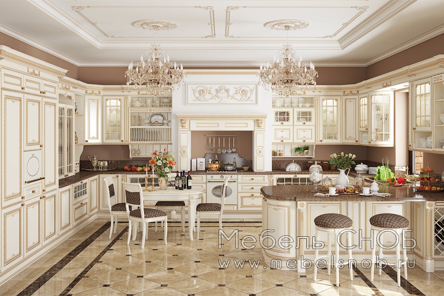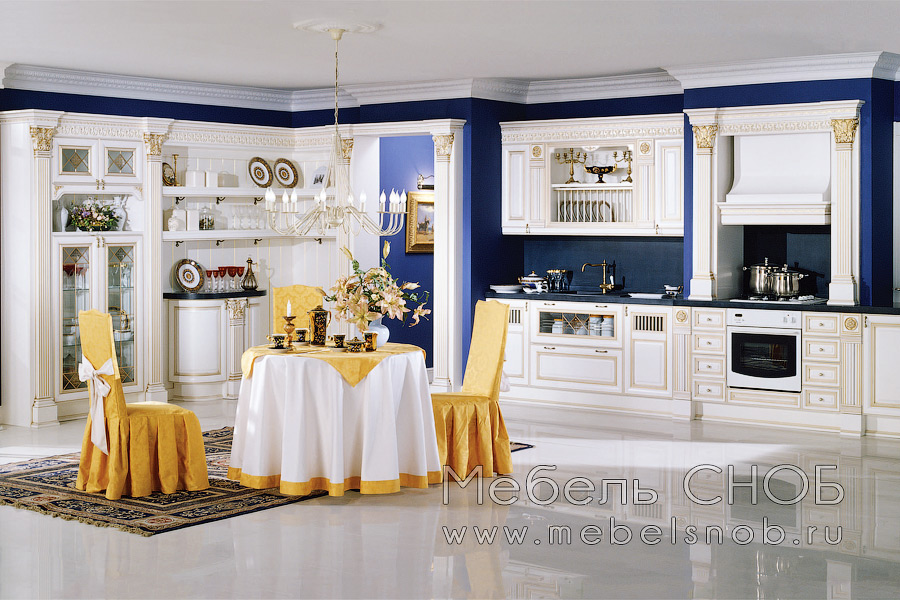 Материал: Рамка фасада - массив ольхи термообработанный. Центральная часть - МДФ, облицованная шпоном тулипье. Отделка - белая с золотой патиной. (Италия), корпуса - ЛДСП Egger (Германия), фурнитура Blum (Германия), аксессуары INOXA (Италия).