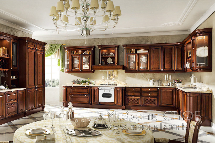 Материал: Рамка фасадов - массив липы. Центральная часть - МДФ, облицованный шпоном черешни. Отделка - тонированием и искусственным старением и глянцевым лакированием. (Италия), корпуса - ЛДСП Egger (Германия), фурнитура Blum (Германия), аксессуары INOXA (Италия).