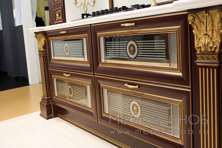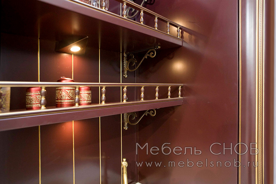 Материал: Рамка фасада - массив ольхи термообработанный. Центральная часть - МДФ, облицованная шпоном тулипье. Отделка - бордовая с золотой патиной. (Италия), корпуса - ЛДСП Egger (Германия), фурнитура Blum (Германия), аксессуары INOXA (Италия).